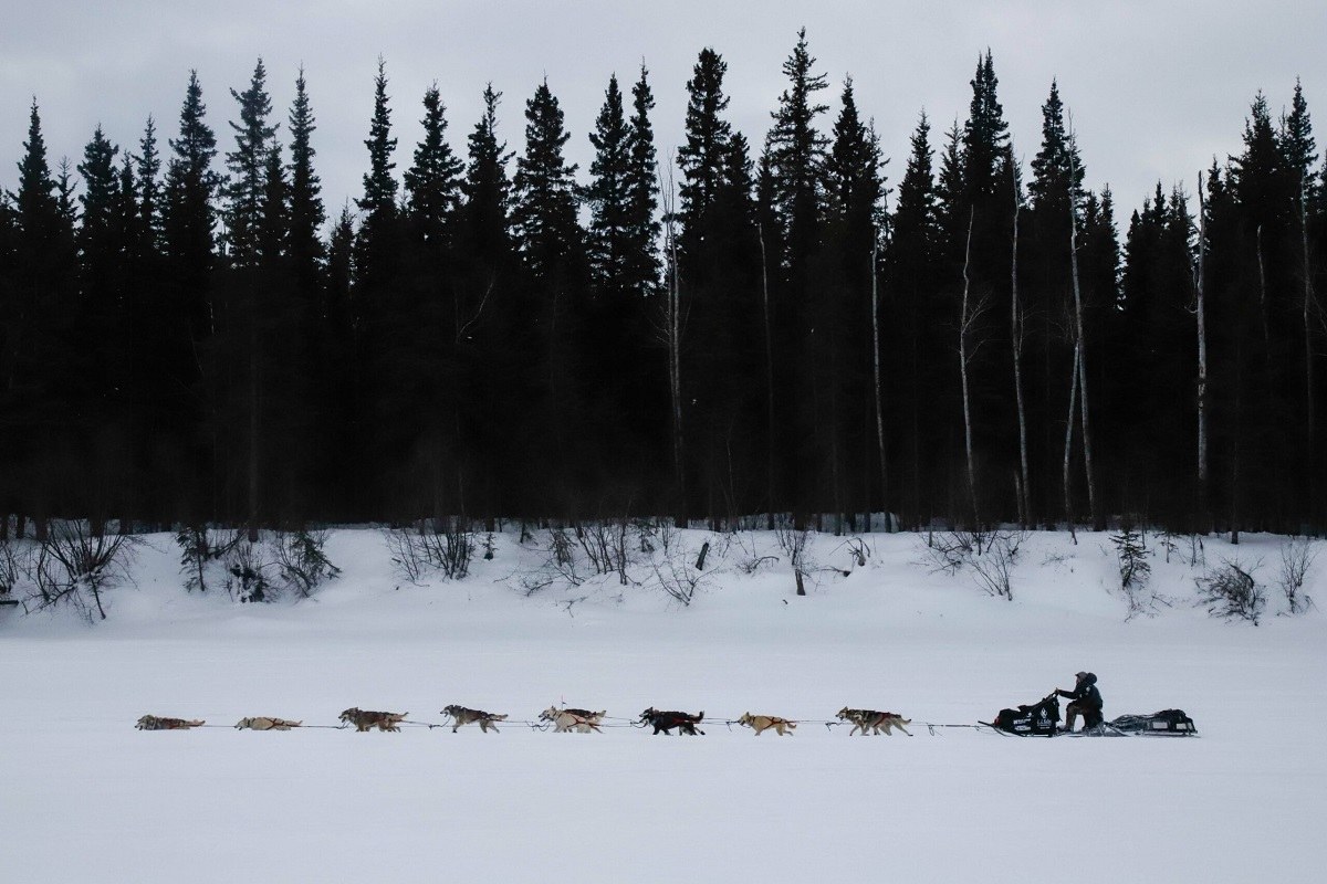 Sass and his 14 dogs in harness did not rest at Nikolai. Sass dropped off one of his dogs and they continued through with 13 dogs. Without a break, Sass took over the lead and opted for a quick rest later along the trail to the McGrath checkpoint.