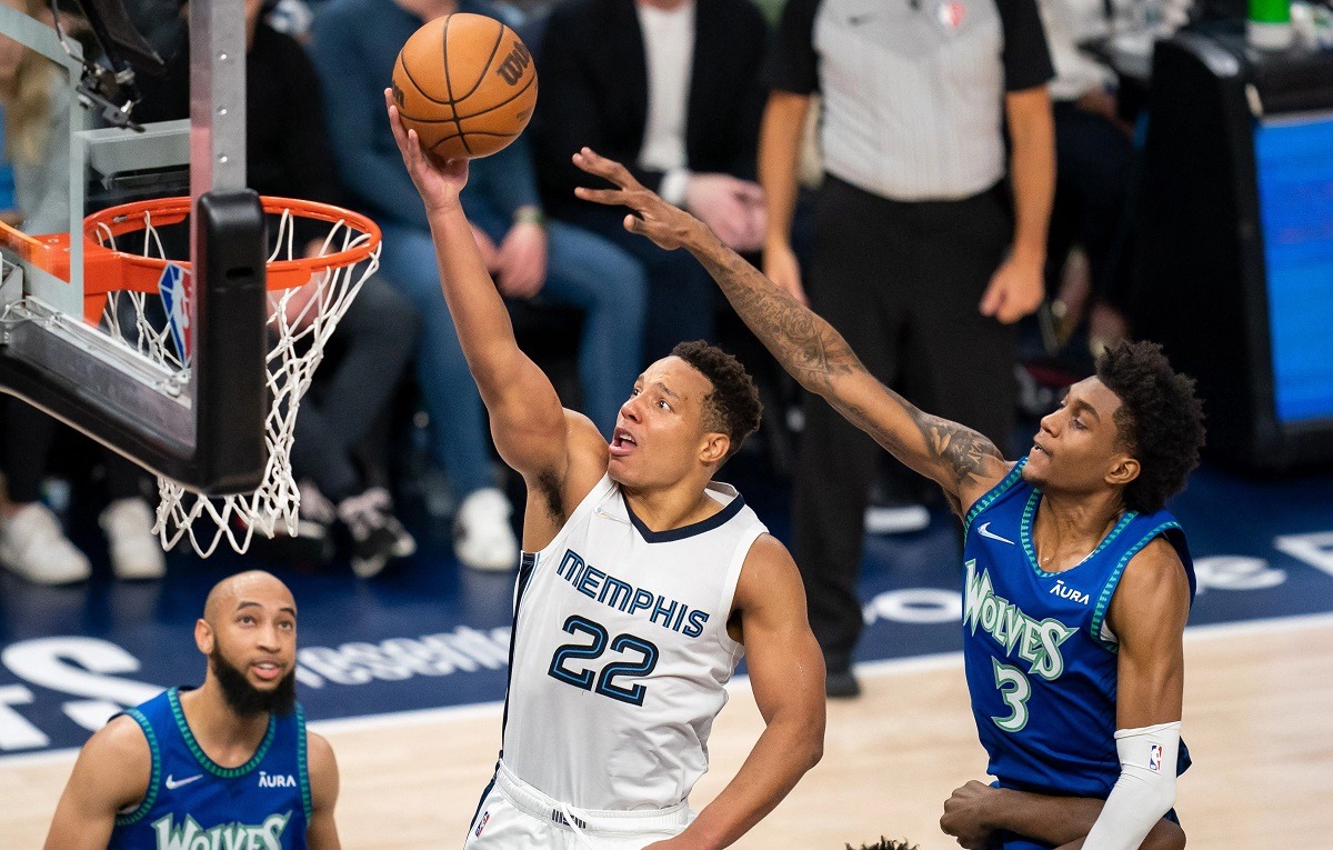 Desmond Bane from the Memphis Grizzlies shots a layup against the Minnesota Timberwolves at Target Center in Game 6. (Image: Brad Rempel/USA Today Sports)