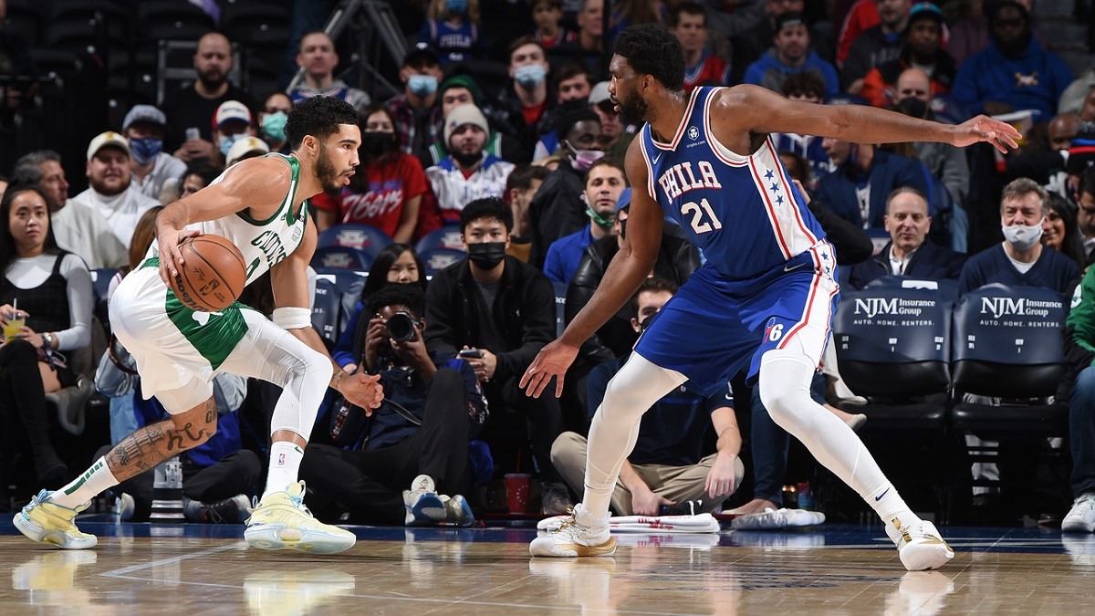 Jayson Tatum from the Boston Celtics is defended by Joel Embiid of the Philadelphia 76ers. Both teams are in a tough fight for the Atlantic Division title.The Celtics (50-30) hold a half-game lead over the 76ers (49-30), but the 76ers have three games remaining while the Celtics play just twice more.