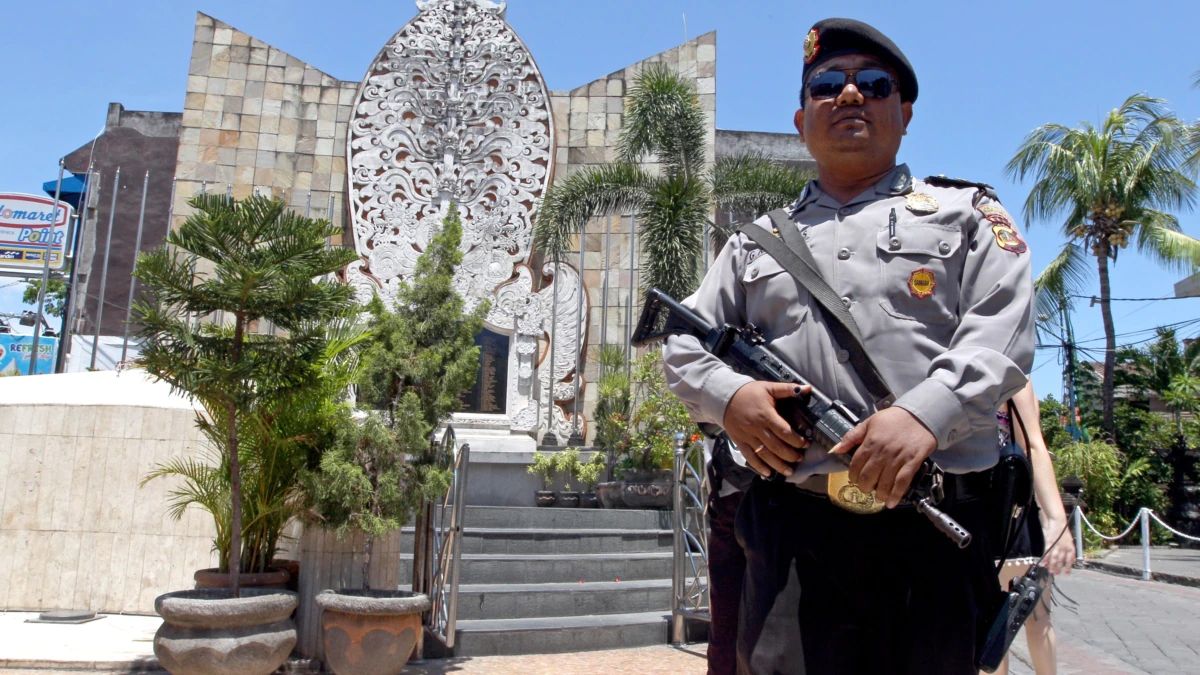 A police officer stands at the memorial of the 2002 Bali bombing site in Bali, Indonesia