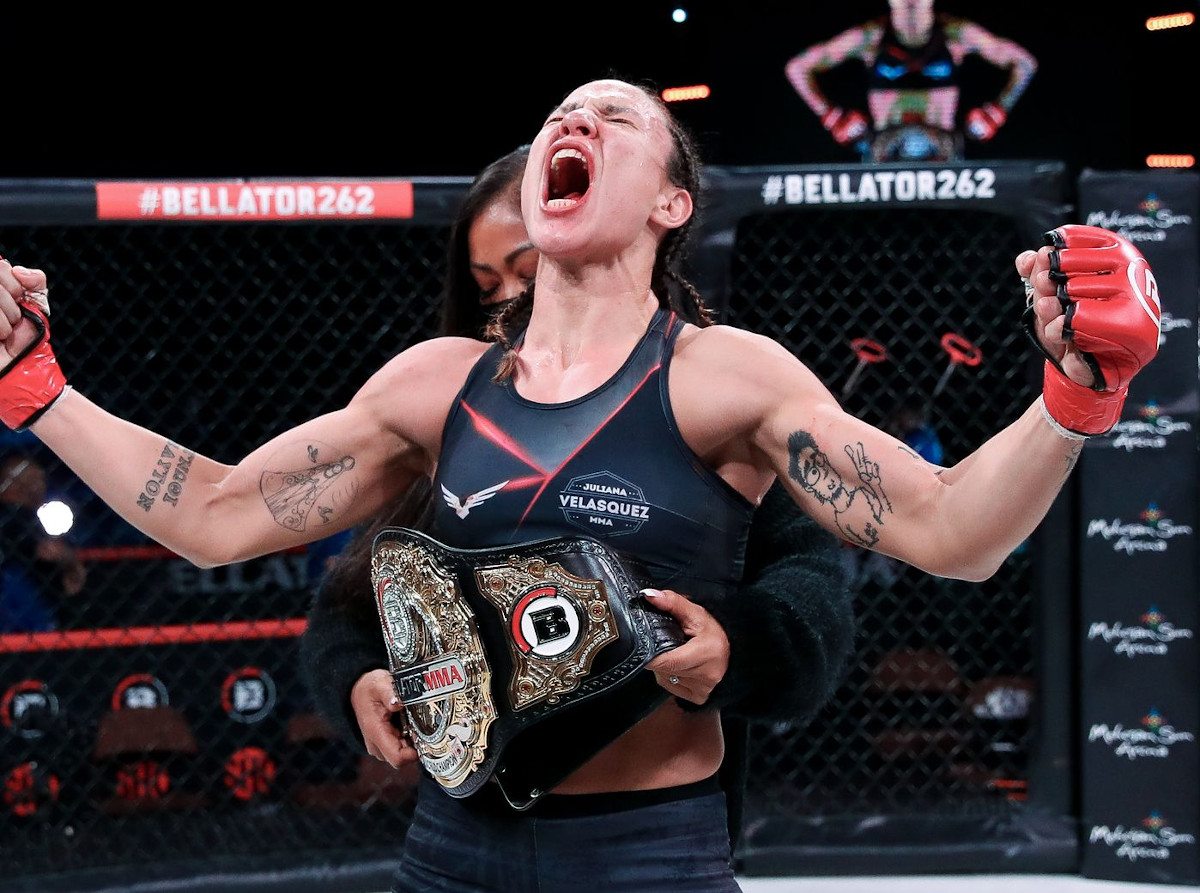 Velasquez has put together seven wins in her Bellator career, and won the flyweight title by beating Ilima-Lei Macfarlane by unanimous decision at Bellator 254 in December 2020. She didn’t exactly dominate her first title defense, beating Denise Kielholtz by split decision, though the majority of media members agreed that Velasquez had won a close bout.