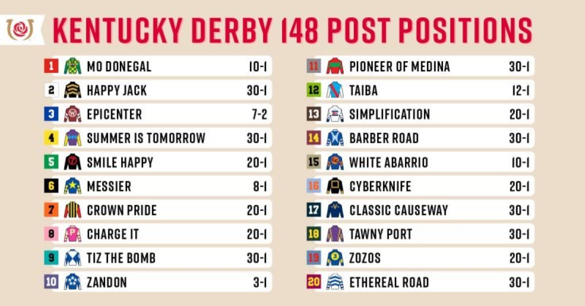 Tim Yakteen, who saddles Messier and Taiba, the horses formerly trained by Bob Baffert, liked where he wound up with both. Messier, the 8/1 third choice drew Post 6 with three-time Derby winner John Velazquez in the irons. The Santa Anita Derby winner who makes only his third career start, Taiba (12/1) drew Post 12 with two-time Derby winner Mike Smith aboard.