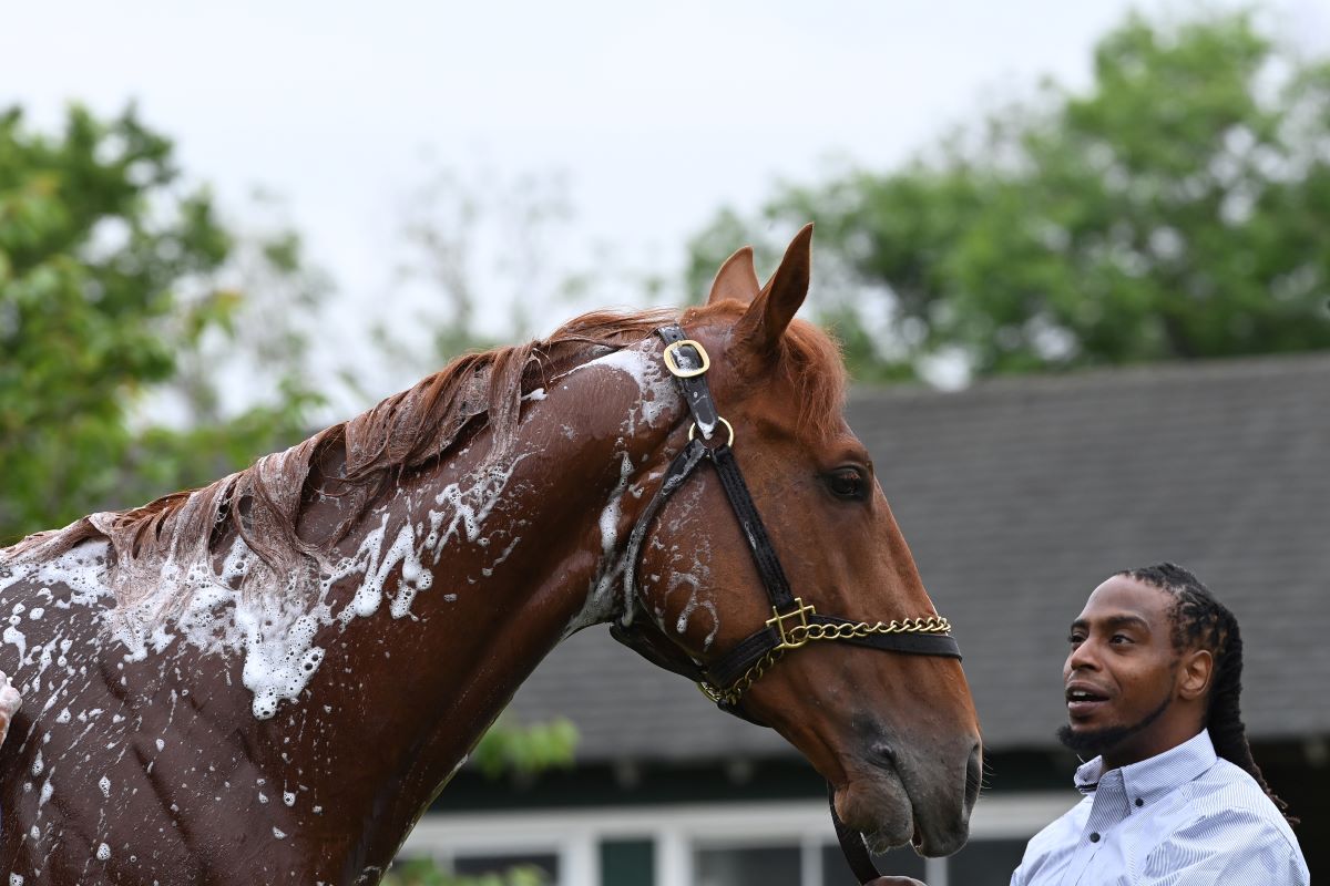 Rich Strike enjoys a bath from groom Jerry Dixon Jr. after arriving at Belmont Park Tuesday morning. The Kentucky Derby champion will go through paddock schooling, then informally work out in the afternoon. (Image: Adam Coglianese)