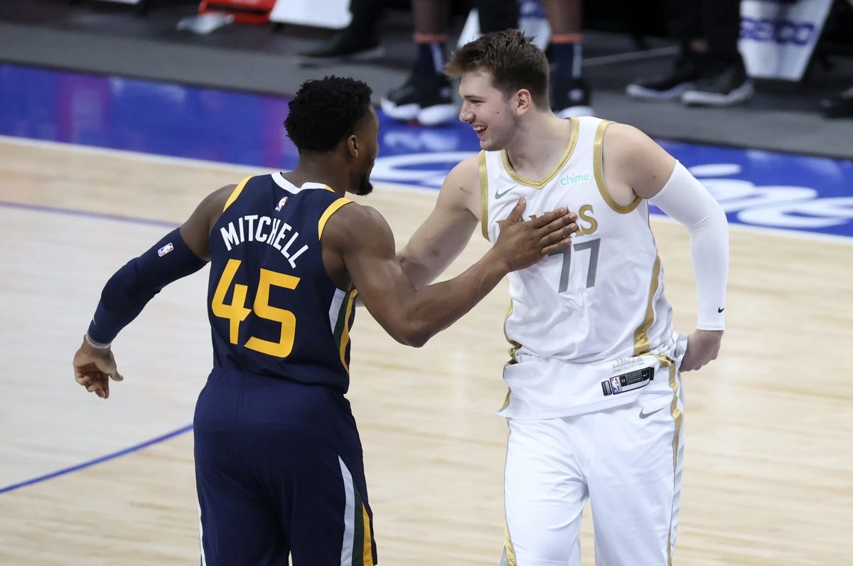 Donovan Mitchell from the Utah Jazz and Luka Doncic from the Dallas Mavs prior to the opening tip earlier this season. (Image: Getty)
