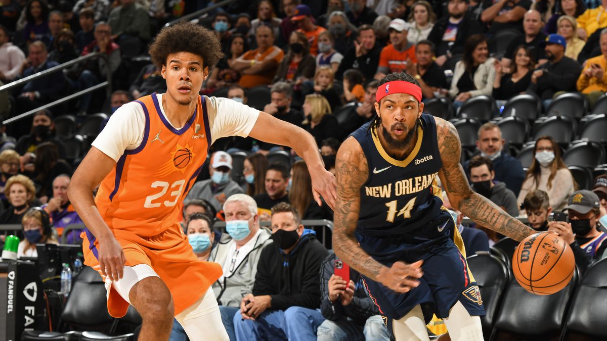 Brandon Ingram (14) from the New Orleans Pelicans blows by Cameron Johnson of the Phoenix Suns. (Image: Kate Frese/Getty)