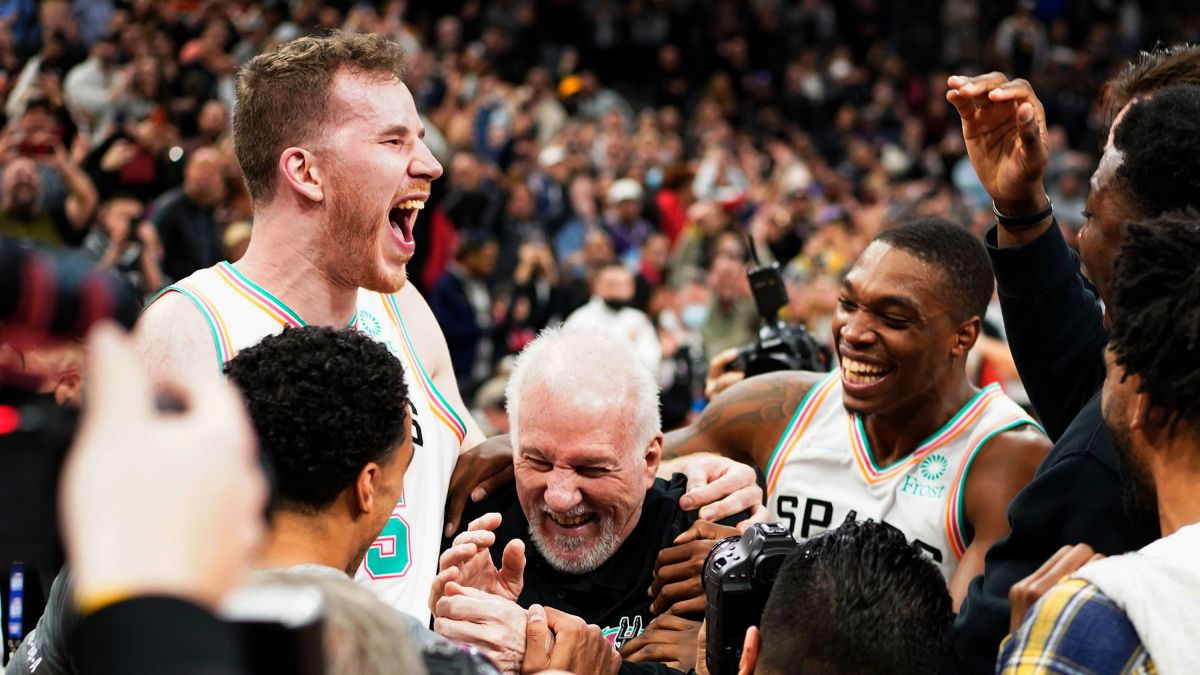 Members of the San Antonio Spurs mob head coach Gregg ‘Pops’ Popovich after he set the new NBA record for most wins as a head coach. (Image: Getty)The San Antonio Spurs had a tough opponent when the Utah Jazz came to town, but the Spurs rallied in the fourth quarter to win 104-102 and help push Pops over the hump with his 1,336th win.