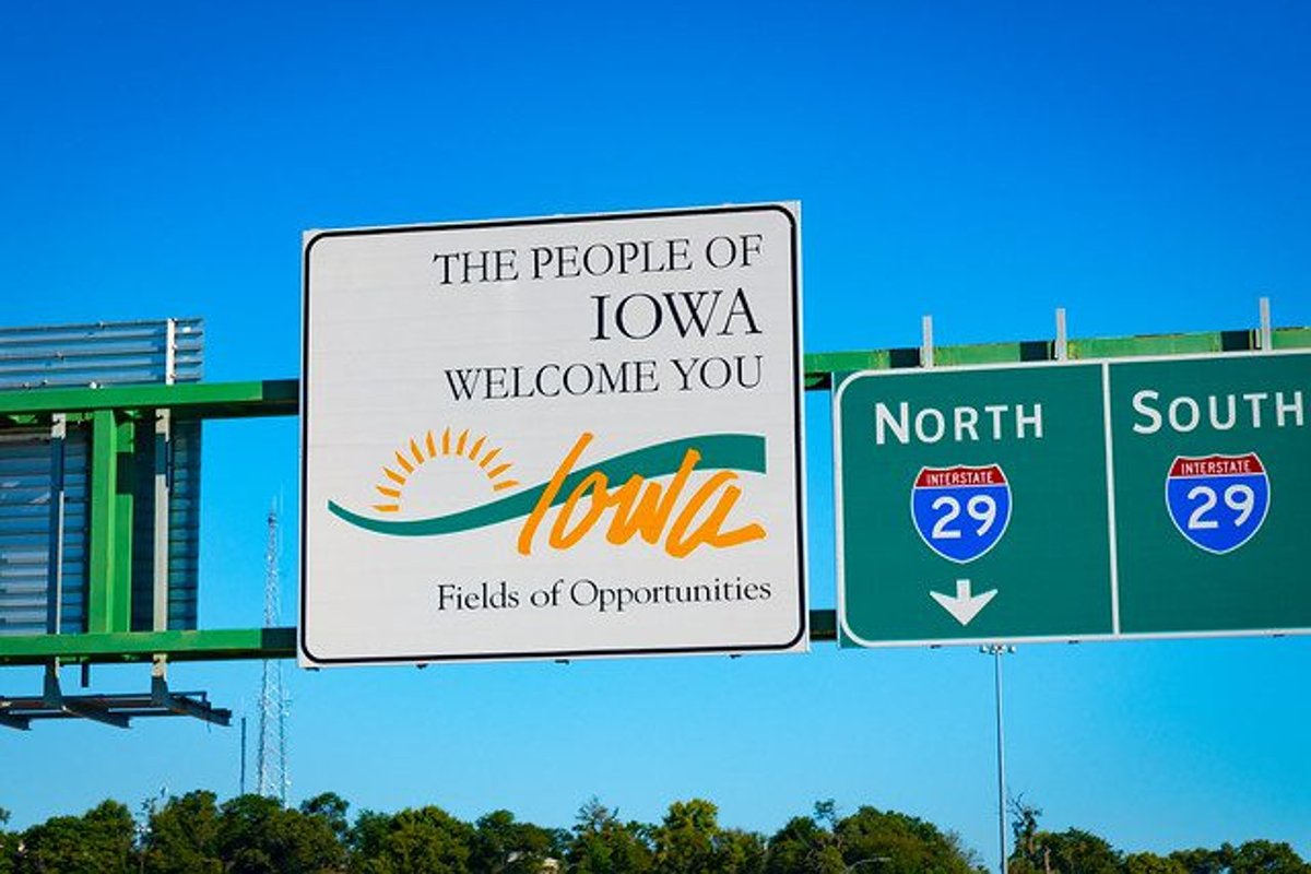A welcome sign hangs over an interstate entering Iowa. State lawmakers want to halt new casino licenses for a two-year period to allow the industry to settle and stabilize in wake of COVID-19. (Image: Shutterstock)