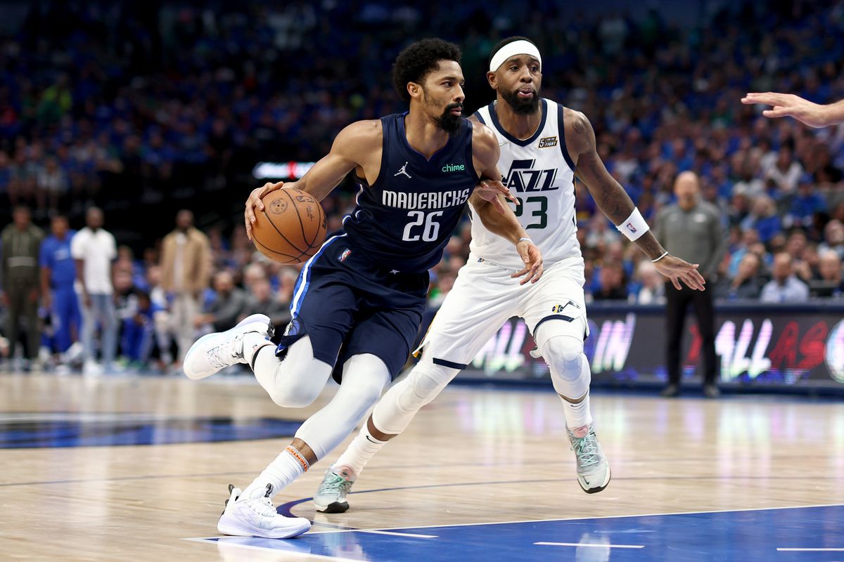 Spencer Dinwiddie (26) from the Dallas Mavericks drives to the hole against Royce O’Neal from the Utah Jazz in Game 1 of the 2022 NBA Playoffs. (Image: Tom Pennington/Getty)