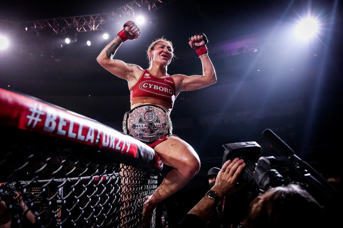 Cris Cyborg defeated Arlene Blencowe on Saturday to defend her Bellator Women’s Featherweight title. (Image: Bellator MMA)