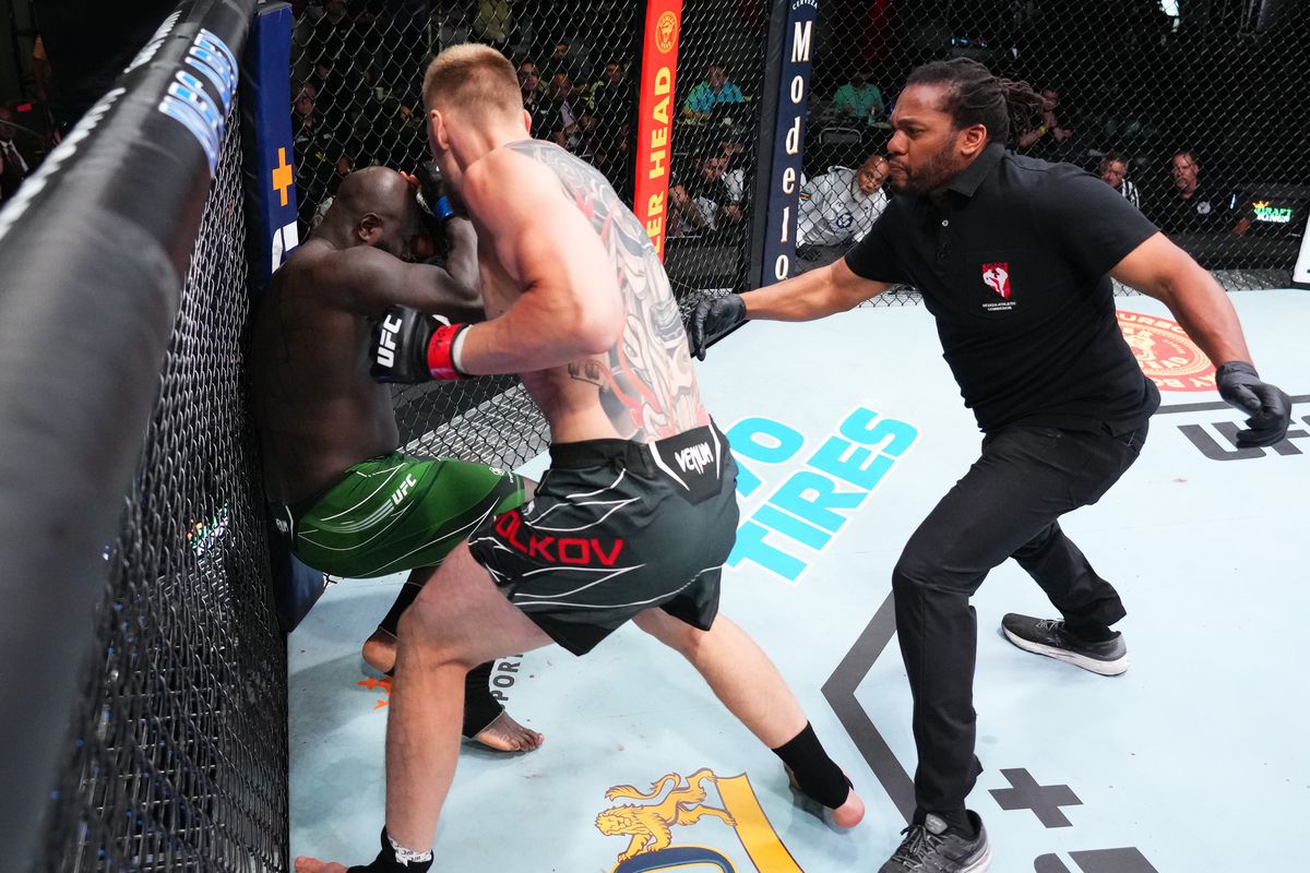 Dean determined that Rozenstruik had stopped intelligently defending himself, though Rozenstruik protested the stoppage. Volkov never knocked down Rozenstruik, though he hurt him multiple times. The win was the fastest of Volkov’s UFC career.
