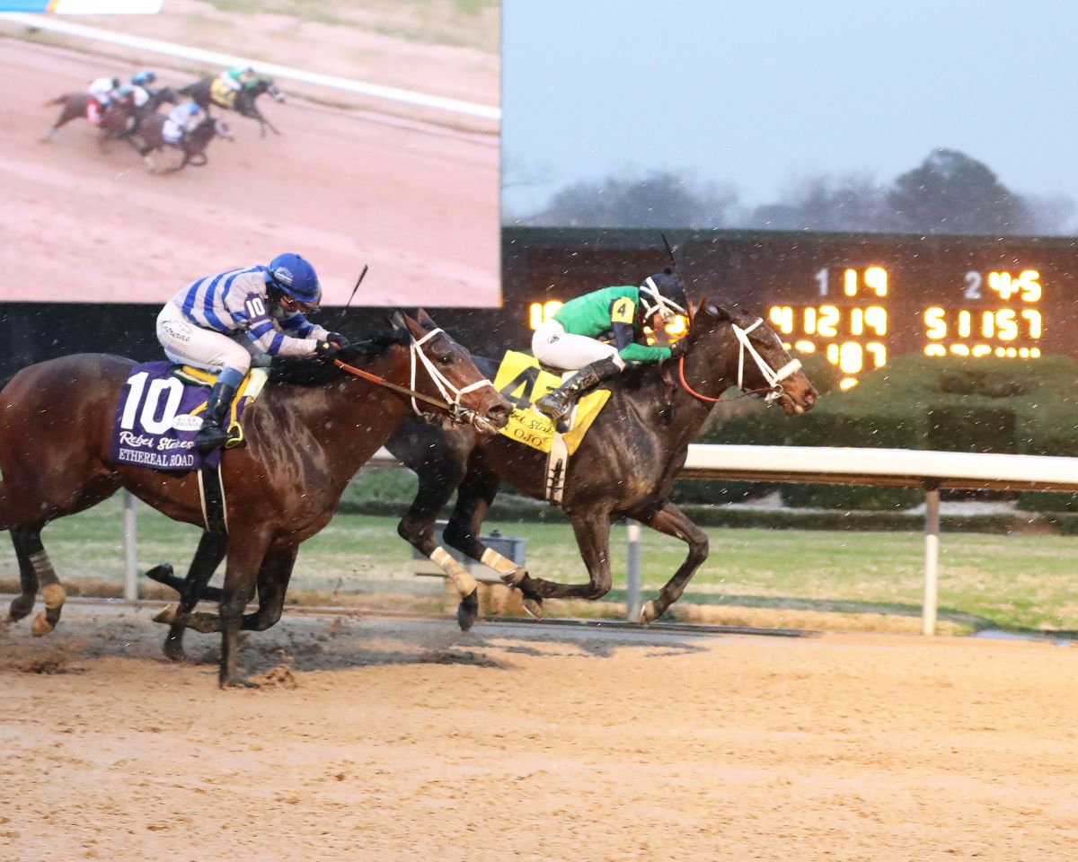 The gelding lost an eye in a paddock accident as a yearling, but has hit the board four times in seven races (2-2-0). His marquee victory came in the Grade 2 Rebel Stakes at Oaklawn Park in March, when he sprung a 75/1 upset.