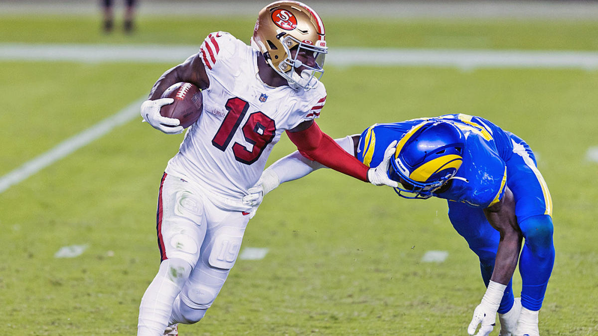 Deebo Samuel from the San Francisco 49ers stiff arms a defender from the LA Rams during an NFC West divisional tilt in 2021. (Image: Getty)Indeed, Samuel demanded a trade back in April, but he got exactly what he wanted with a lucrative contract extension and a guaranteed payday. The new contract includes a whopping $58.1 million in guaranteed money.