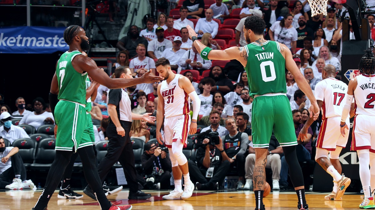 Jaylen Brown and Jayson Tatum from the Boston Celtics celebrate a Game 2 victory over the Miami Heat at American Airlines Arena. (Image: Garcia Jerome)The Eastern Conference finals shift to Boston for the next two games, with Game 3 scheduled for Friday and Game 4 slated for Sunday. The Celtics opened Game 3 as a -6.5 favorite, but the line is currently -6.