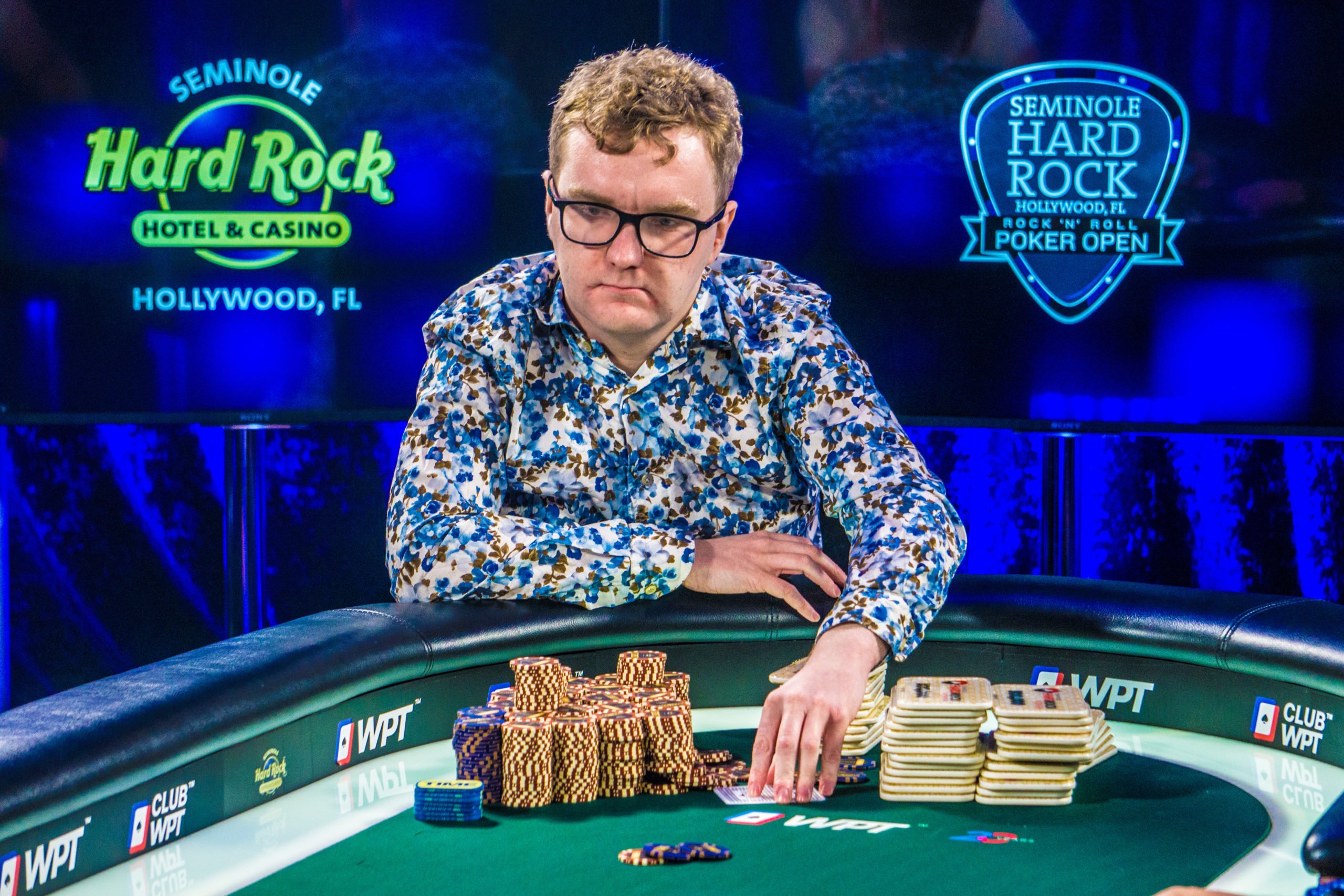 Andrew Wilson with his chips during the WPT Seminole Rock ‘N’ Roll Poker Open Main Event. He outlasted the field to win the event. (Image: Seminole Hard Rock Poker Open)
