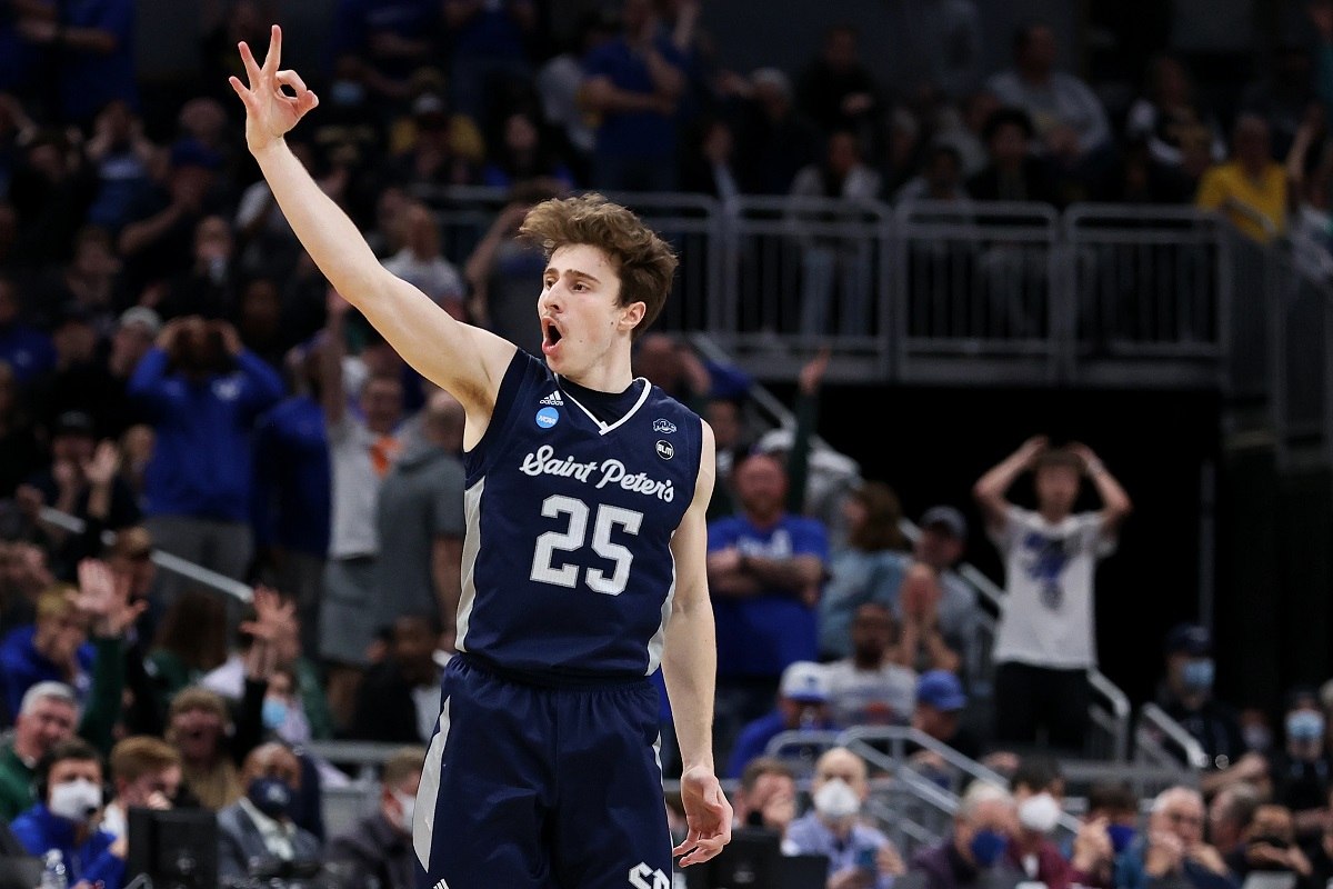 Doug Edert, a junior guard from Saint Peter’s, celebrates a 3-pointer during an upset against Kentucky. (Image: Getty)Only one #1 seed busted when Baylor, last year’s champion, was picked off by North Carolina in one of the worst officiated games in recent March Madness history. But there is still a trio of #1 seeds remaining, including Gonzaga, Arizona, and Kansas.